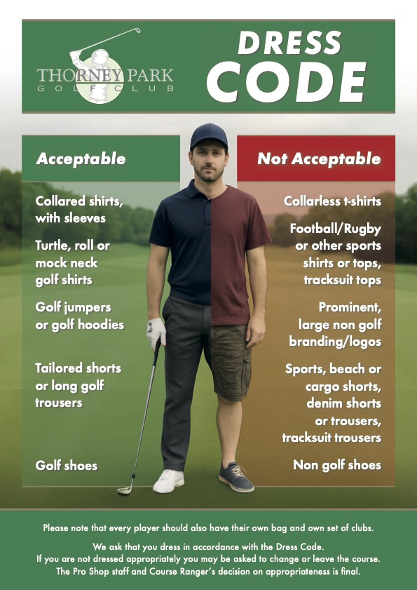 - Please note that you will be asked to change your clothing or purchase clothing from the Pro Shop prior to play, should it not conform to the dress code. Please therefore ensure that you turn up in the correct clothing.